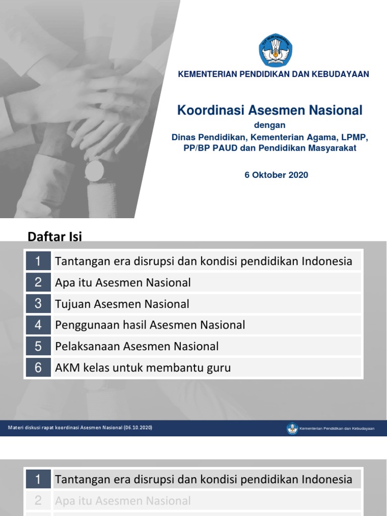 Asesmen nasional adalah pdf. Peningkatan sistem evaluasi pendidikan adalah bagian dari kebijakan Merdeka Belajar yang juga didukung penuh oleh Presiden Joko Widodo. Lembar Tanya Jawab AKM pdf. Numerasi adalah kemampuan berpikir menggunakan konsep prosedur fakta dan alat matematika untuk menyelesaikan masalah sehari-hari pada berbagai jenis konteks yang relevan untuk individu sebagai warga negara Indonesia dan dunia.